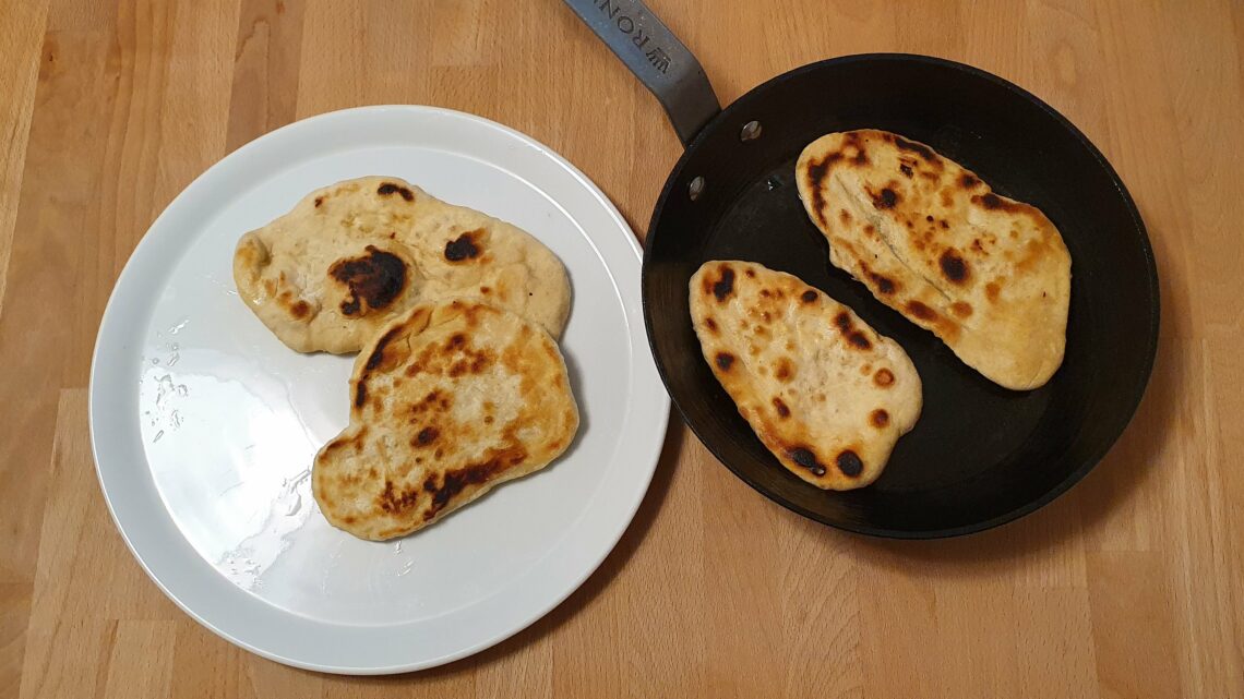 - Das fertige Naan-Brot nun von der Pfanne in den Ofenwandern lassen und dort warmhalten.