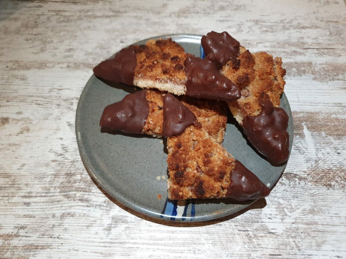 - Sobald die Nussecken ausgekühlt sind, die Schokolade im Wasserbad zum schmelzen bringen und je zwei Ecken einer Nussecke eintauchen und zum trocknen auf ein Backpapier legen.