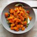 - Den (Bio) Kürbis gut waschen, entkernen und ebenfalls in mundgerechte Stücke schneiden.