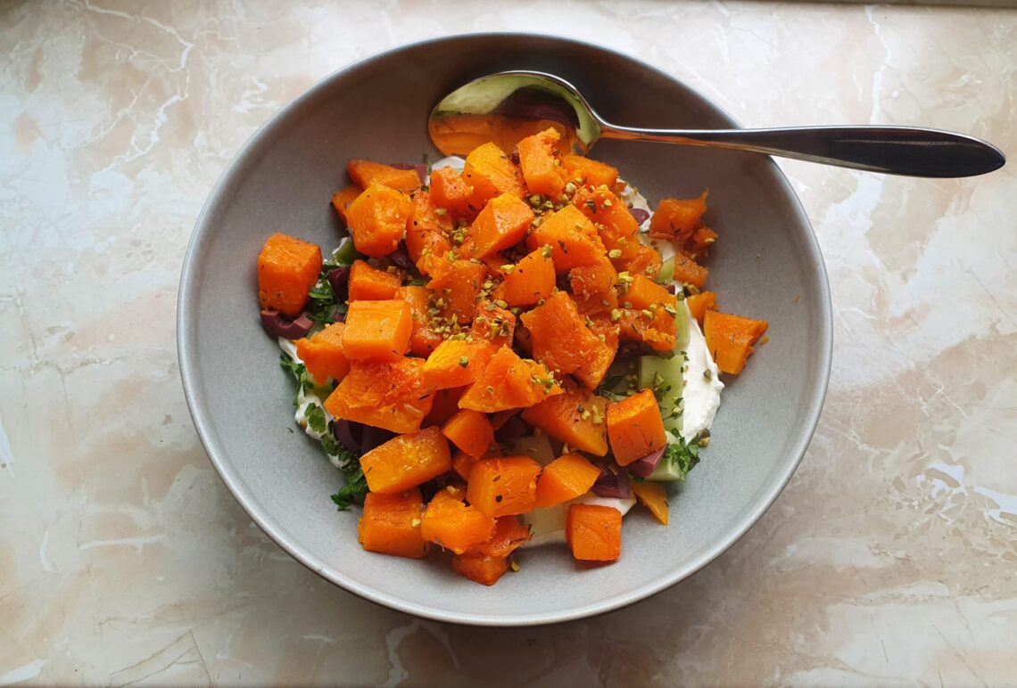 Achja die Kürbiszeit, die hat es mir wie eigentlich jedes Jahr auch dieses Jahr so richtig angetan. Mein absolutes Lieblingsrezept des Jahres ist dieser Butternutkürbis aus dem Ofen, lecker gewürzt und auf einem erfrischenden „Bett“ aus Joghurt, Gurke und Oliven. Ich weiß, diese Kombination liest sich erst mal sehr ungewohnt, aber glaubt mir, es ist der Hammer. Also ran an den Kürbis.